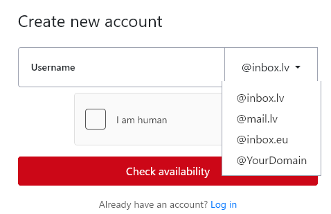 @mail.lv は有料、@inbox.eu と @YourDomain は inbox.eu へのリンクなので、@inbox.lv を選択します。