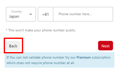 作成途中の電話番号入力は Back でメールアドレスに切り替えできます。