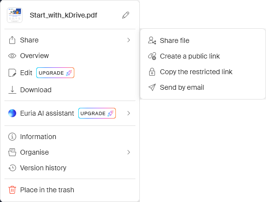 Copy the restricted link は、ほかの kDrive ユーザーとの共有用の URL を発効します。