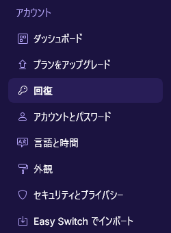 設定 (右上歯車) → 回復 (左メニュー)